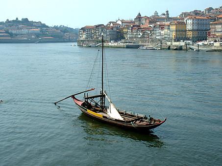 Barco Rabelo tendo como fundo a zona da Ribeira do Porto.