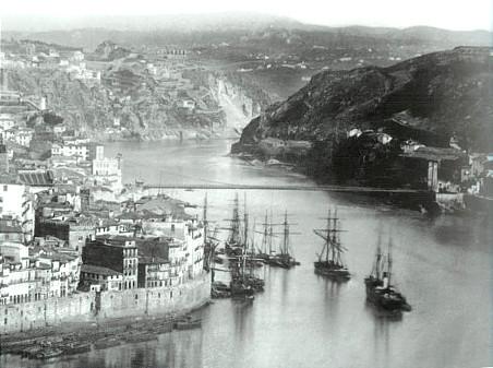 Quando os grandes veleiros vinham descagar o carvão e o bacalhau ao cais da Ribeira. Ao lonje ainda se pode ver a ponte pensil da qual só restam os pilares.