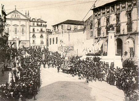 Ano de 1894. O cortejo e o carro alegórico dirigem-se para a Praça do Infante. Do lado direito pode-se ver o antigo Convento de São Bento de Avé Maria que seria destruído um ano depois em 1895 para dar lugar à estação de S. Bento.  |