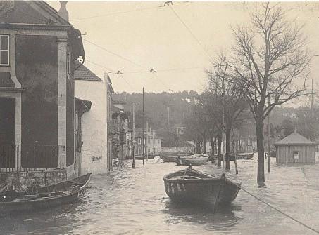 Por vezes o Douro sobe e invade as margens do Porto e de Vila Nova de Gaia. Esta fotografia é da Cantareia na Foz do Douro e foi titada em 23 de Dezembro de 1909.