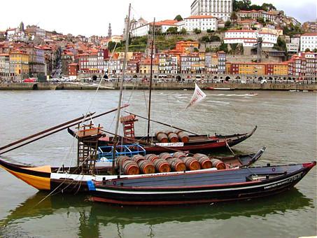 Rabelos carregados com pipas de vinhos do porto tendo como fundo a Ribeira.