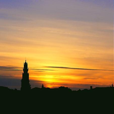 O contorno da cidade num céu que se despede do dia. O edifício solitário que se destaca é a Torre dos Clérigos.