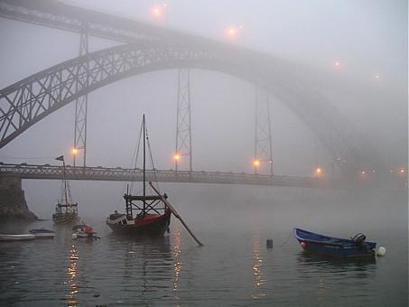 A ponte e os barcos Rabelos mergulhados no nevoeiro que envolve a cidade