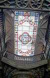 Nos pilares, à esquerda e à direita, distinguem-se os bustos de ilustres homens de letras: Eça de Queiroz, Camilo Castelo Branco, Antero de Quental, Tomás Ribeiro, Teófilo Braga e Guerra Junqueiro. Obra do escultor e distinto artista Romão júnior, estão cobertos por baldaquinos, rendühados em estilo gótico. O tecto, lavrado, resguarda no centro uma luminosidade diáfana que provém do amplo vitral em que se desenha o ex-libris de Lello & Irmão, Lda, com a conhecida divisa Decus in Labore. Como escreveu um afamado jornalista do princípio do século, a riqueza de tons do grande vitral, o recorte gracioso das janelas, a balaustrada da galeria e os grandes candelabros situados nos ângulos que demarcam esse espaço, as linhas das ogivas que se entrelaçam no tecto sob os florões e que vêm morrer nas nervuras que correm pelos pilares até às mísulas, deixam o visitante deslumbrado.