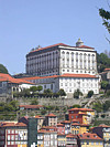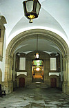 Ao fundo, há três janelões, preenchidos com vitrais, em que figuram os três tipos do brasão do Porto.