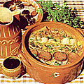300g de arroz Confecção: De véspera ponha o feijão de molho, limpe e lave muito bem a dobrada e mãozinhas, escalde e coza, temperando com pedacinhos de cenoura, uma cebola pequena com dois cravinhos espetados e alguns grãos de pimenta. Normalmente a mãozinha coze primeiro que a dobrada, retirando-se logo que esteja cozida. No próprio dia põe-se o feijão branco a cozer com a cenoura cortada em pedacinhos. Coze-se também o frango, a orelha de porco, o presunto e os enchidos (excepto o chouriço de carne), retirando para fora os elementos que forem ficando cozidos. Escolha e corte também em pedacinhos a dobrada e as mãozinhas. Faça um refogado com azeite, o alho, e a cebola picados e o raminho de cheiros. Quando começar a alourar junte o vinho branco, a polpa de tomate, o chouriço de carne e o toucinho e um pouco de caldo onde cozeu a dobrada (ou caldo de cozer as carnes) passado por passador. Ferve lentamente cerca de 45 minutos. Junte a dobrada e as mãos, retire o chouriço de carne e o toucinho magro, deixe apurar cerca de 15 minutos acrescentando caldo se for preciso. Junte o feijão adicionando mais um pouco de caldo ou água do feijão, se for necessário. Deixe ferver mais 10 ou 15 minutos, rectifique de sal, pimenta e piri-piri (facultativo), misture uma pitada de cominhos, mexendo com cuidado. Sirva em travessa ou outro recipiente, espalhando por cima a orelha cortada em tirinhas finas, o presunto e o frango desfiados, rodelas de salpicão e fatias de toucinho. Polvilhe com salsa picada. À parte sirva o arroz de manteiga seco, feito no forno coberto com rodelas de chouriço de sangue e de carne. |